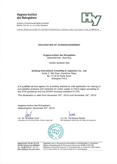 我们公司荣获德国KTW/W270认证机构在中国的咨询授权代理证书